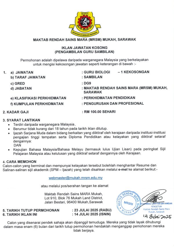 Iklan Kini Jawatan Kosong Maktab Rendah Sains Mara (MRSM) Mukah Like serta Ikut Facebook Kami, follow Chanel WhatsApp Jawatan Kosong & Telegram Portal SPA9 untuk capaian pantas kekosongan jawatan daripada kami sekarang. Klik Jawatan Disini