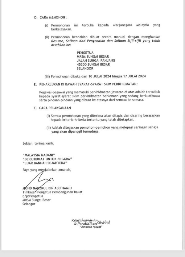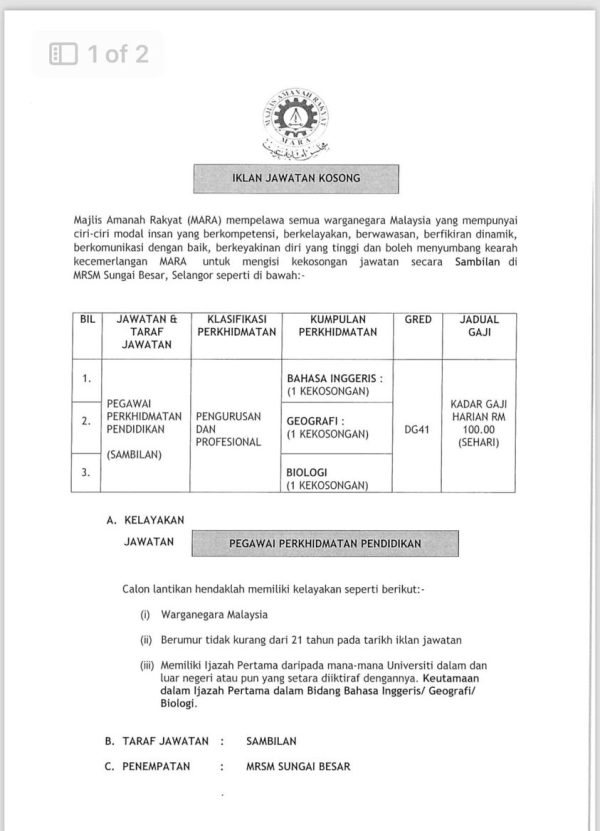Iklan Kini Jawatan Kosong Maktab Rendah Sains MARA (MRSM) Sungai Besar Like serta Ikut Facebook Kami, follow Chanel WhatsApp Jawatan Kosong & Telegram Portal SPA9 untuk capaian pantas kekosongan jawatan daripada kami sekarang.