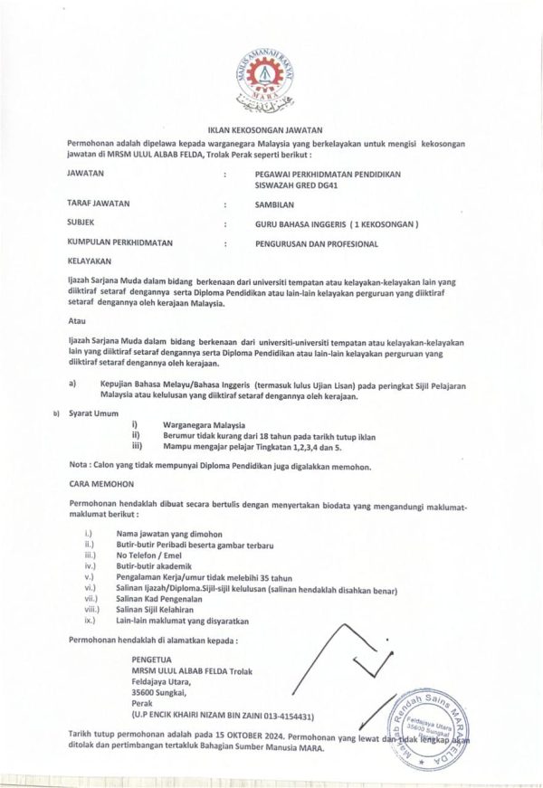 Iklan Kini Jawatan Kosong Maktab Rendah Sains Mara (MRSM) Ulul Albab Bagan Datuk Like serta Ikut Facebook Kami, follow Chanel WhatsApp Jawatan Kosong & Telegram Portal SPA9 untuk capaian pantas kekosongan jawatan daripada kami sekarang.