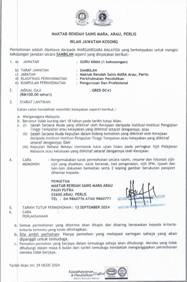 Iklan Kini Jawatan Kosong Maktab Rendah Sains MARA (MRSM) Like serta Ikut Facebook Kami, follow Chanel WhatsApp Jawatan Kosong & Telegram Portal SPA9 untuk capaian pantas kekosongan jawatan daripada kami sekarang. Klik Jawatan Disini