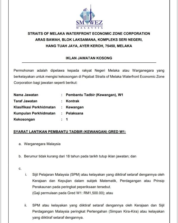 Iklan Kini Jawatan Kosong Melaka Waterfront Economic Zone Corporation Klik Jawatan Disini Like serta Ikut Facebook Kami, follow Chanel WhatsApp Jawatan Kosong & Telegram Portal SPA9 untuk capaian pantas kekosongan jawatan daripada kami sekarang.