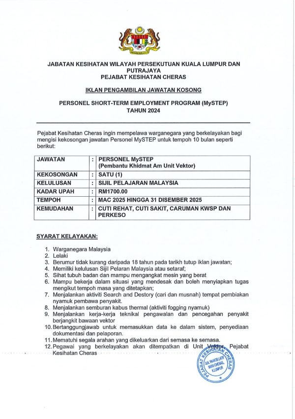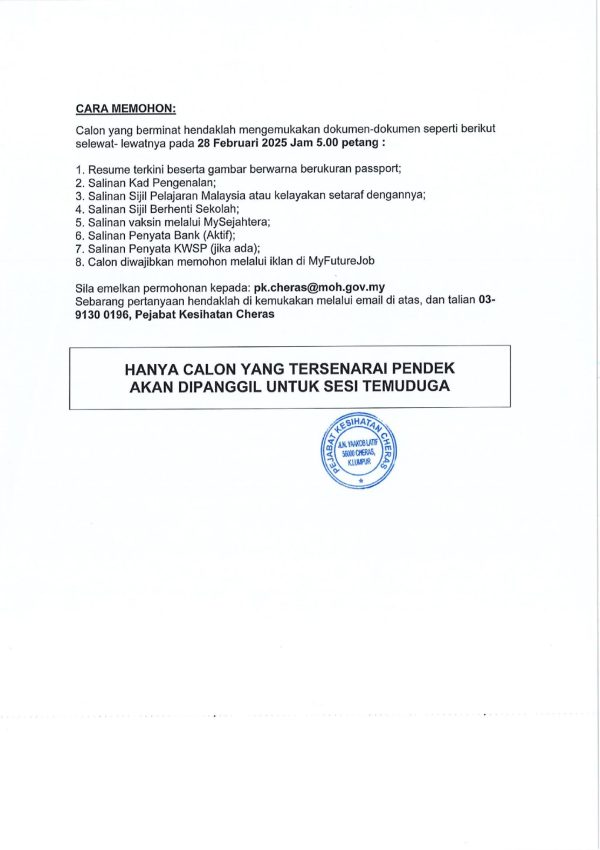 Iklan Kini Jawatan Kosong Pejabat Kesihatan Cheras Klik Jawatan Disini Like serta Ikut Facebook Kami, follow Chanel WhatsApp Jawatan Kosong & Telegram Portal SPA9 untuk capaian pantas kekosongan jawatan daripada kami sekarang.