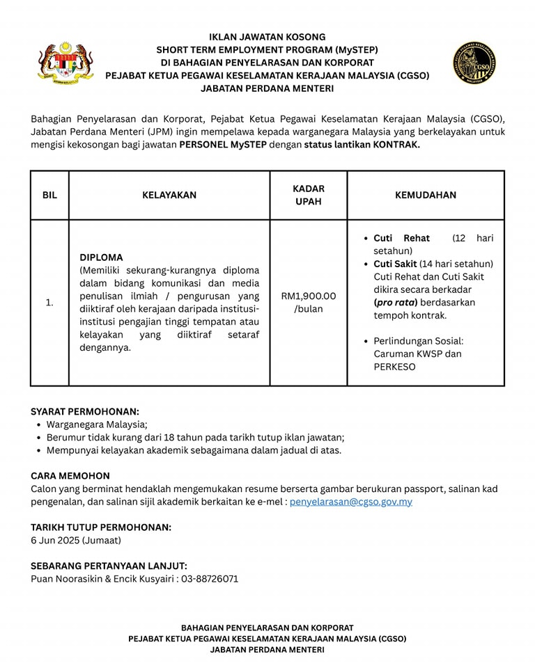 Iklan Kini Jawatan Kosong Pejabat Ketua Pegawai Keselamatan Kerajaan Malaysia Like serta Ikut Facebook Kami, follow Chanel WhatsApp Jawatan Kosong & Telegram Portal SPA9 untuk capaian pantas kekosongan jawatan daripada kami sekarang. Klik Jawatan Disini