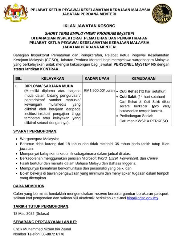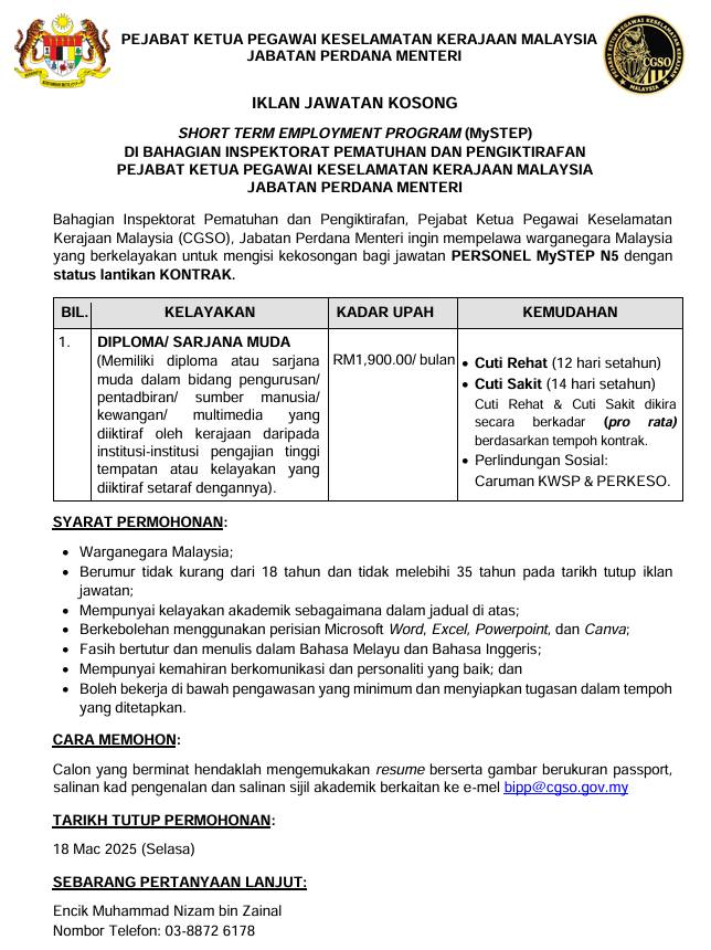 Iklan Kini Jawatan Kosong Pejabat Ketua Pegawai Keselamatan Kerajaan Malaysia Like serta Ikut Facebook Kami, follow Chanel WhatsApp Jawatan Kosong & Telegram Portal SPA9 untuk capaian pantas kekosongan jawatan daripada kami sekarang.