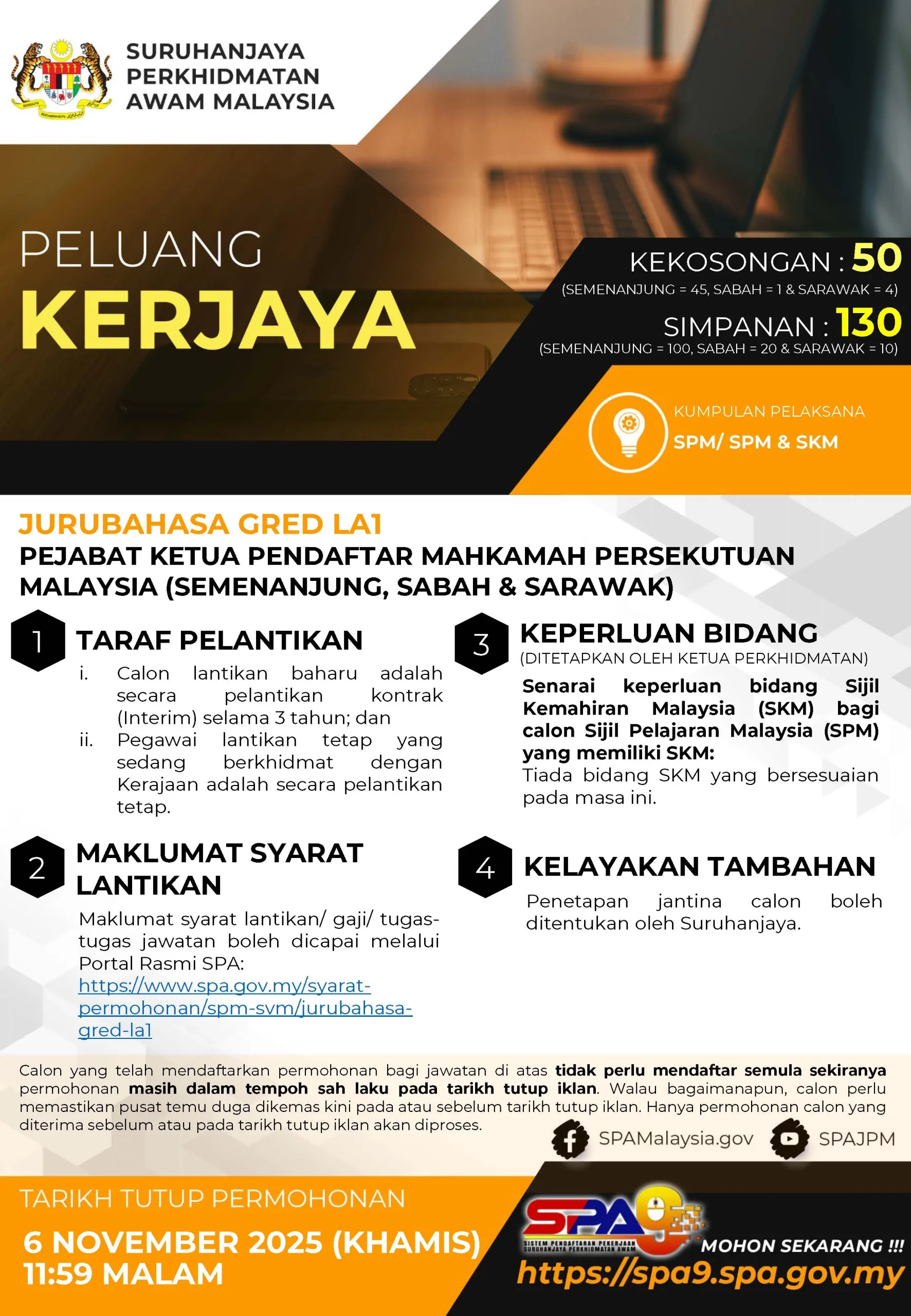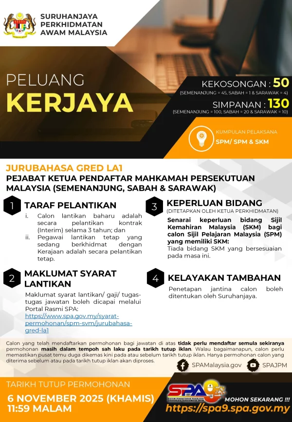 Iklan Kini Jawatan Kosong Pejabat Ketua Pendaftar Mahkamah Persekutuan Like serta Ikut Facebook Kami, follow Chanel WhatsApp Jawatan Kosong & Telegram Portal SPA9 untuk capaian pantas kekosongan jawatan daripada kami sekarang. Klik Iklan Disini