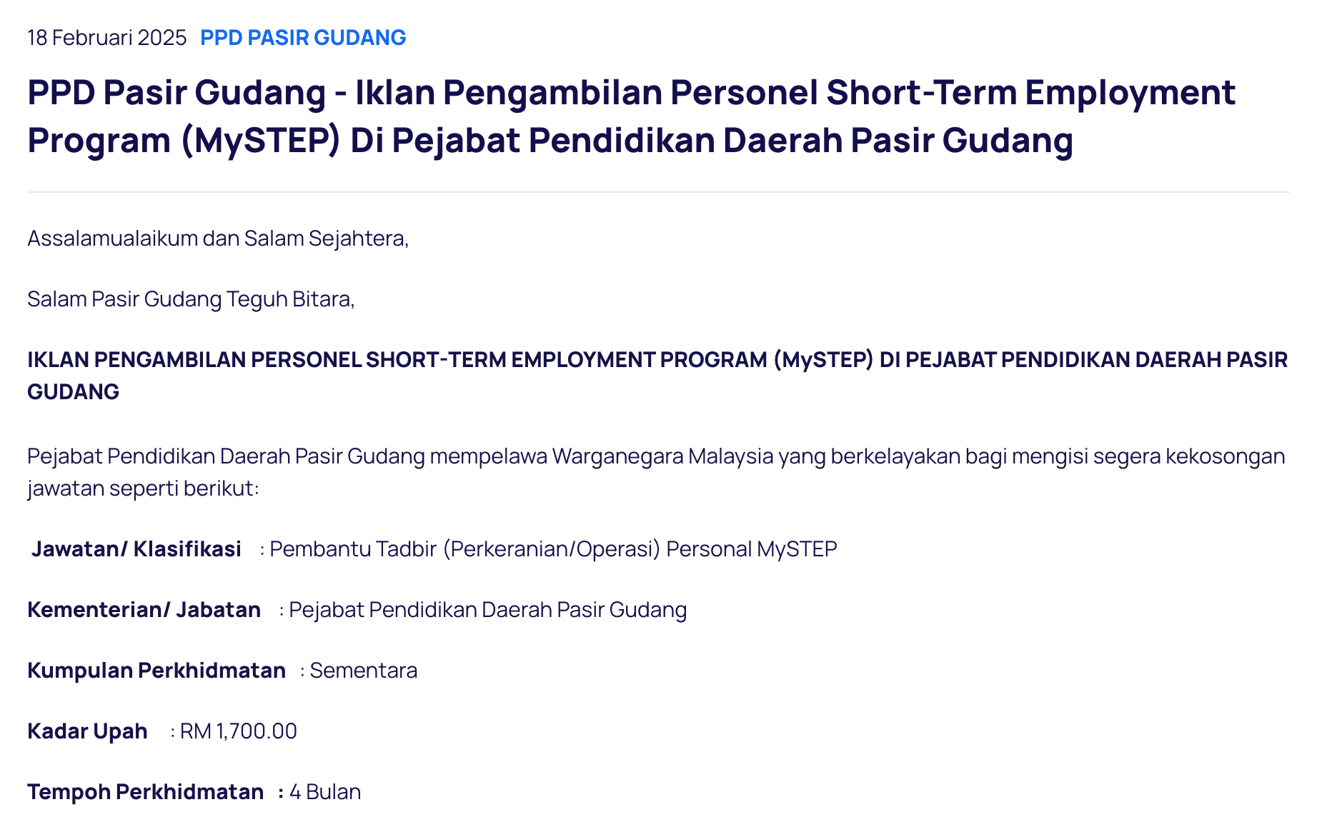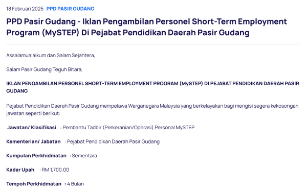 Iklan Kini Jawatan Kosong Pejabat Pendidikan Daerah Pasir Gudang Like serta Ikut Facebook Kami, follow Chanel WhatsApp Jawatan Kosong & Telegram Portal SPA9 untuk capaian pantas kekosongan jawatan daripada kami sekarang. Klik Jawatan Disini