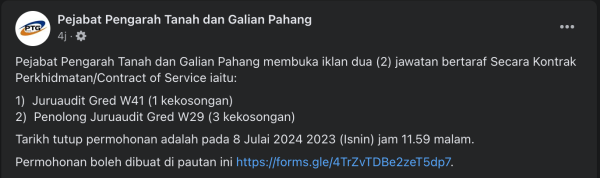 Iklan Kini Jawatan Kosong Pejabat Pengarah Tanah dan Galian Pahang Like serta Ikut Facebook Kami, follow Chanel WhatsApp Jawatan Kosong & Telegram Portal SPA9 untuk capaian pantas kekosongan jawatan daripada kami sekarang. Klik Jawatan Disini
