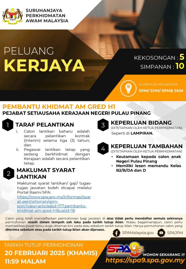 Iklan Kini Jawatan Kosong Pejabat Setiausaha Kerajaan Negeri Pulau Pinang Like serta Ikut Facebook Kami, follow Chanel WhatsApp Jawatan Kosong & Telegram Portal SPA9 untuk capaian pantas kekosongan jawatan daripada kami sekarang. Klik Jawatan Disini