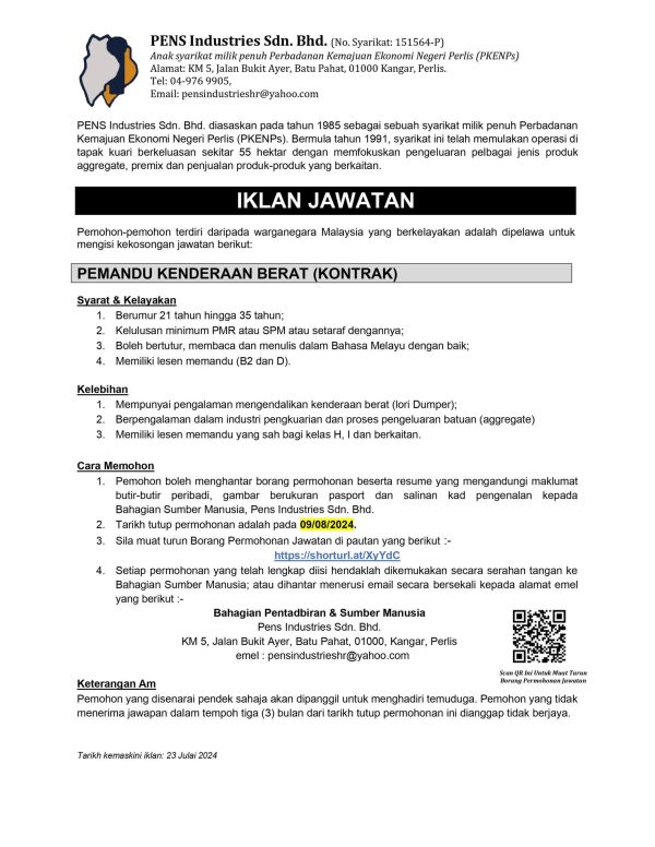 Iklan Kini Jawatan Kosong PENS Industries Sdn Bhd Klik Jawatan Disini Like serta Ikut Facebook Kami, follow Chanel WhatsApp Jawatan Kosong & Telegram Portal SPA9 untuk capaian pantas kekosongan jawatan daripada kami sekarang.