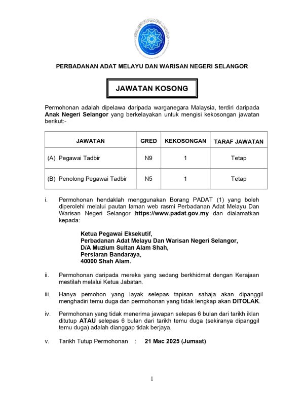 Iklan Kini Jawatan Kosong Perbadanan Adat Melayu & Warisan Negeri Selangor (PADAT) Klik Jawatan Disini Like serta Ikut Facebook Kami, follow Chanel WhatsApp Jawatan Kosong & Telegram Portal SPA9 untuk capaian pantas kekosongan jawatan daripada kami sekarang.