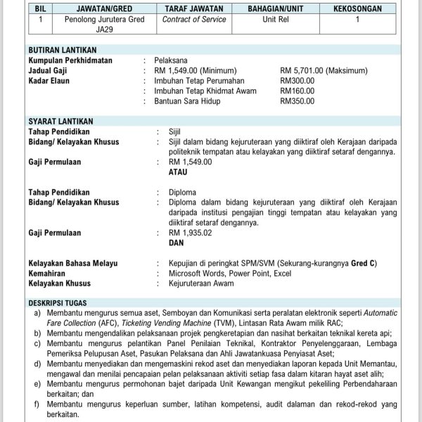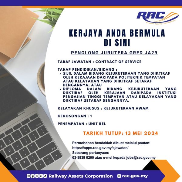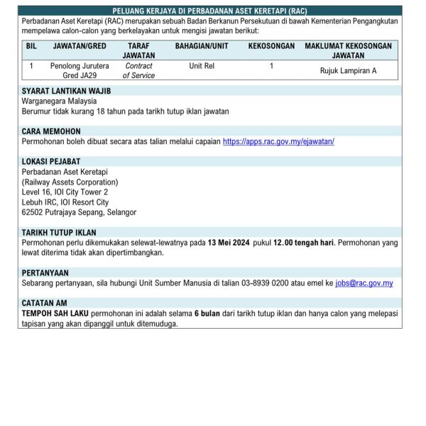 Iklan Kini Jawatan Kosong Perbadanan Aset Keretapi (RAC) Like serta Ikut Facebook Kami, follow Chanel WhatsApp Jawatan Kosong & Telegram Portal SPA9 untuk capaian pantas kekosongan jawatan daripada kami sekarang.