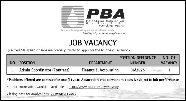 Iklan Kini Jawatan Kosong Perbadanan Bekalan Air Pulau Pinang Sdn Bhd PBA_21Feb_NST Like serta Ikut Facebook Kami, follow Chanel WhatsApp Jawatan Kosong & Telegram Portal SPA9 untuk capaian pantas kekosongan jawatan daripada kami sekarang.