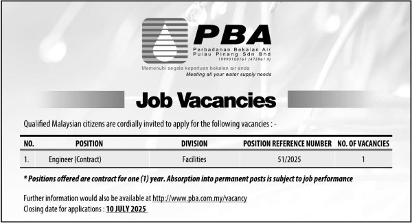 Iklan Kini Jawatan Kosong Perbadanan Bekalan Air Pulau Pinang Sdn Bhd