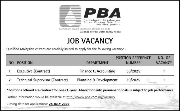 Iklan Kini Jawatan Kosong Perbadanan Bekalan Air Pulau Pinang Sdn Bhd PBA_11Jul_NST Like serta Ikut Facebook Kami, follow Chanel WhatsApp Jawatan Kosong & Telegram Portal SPA9 untuk capaian pantas kekosongan jawatan daripada kami sekarang.