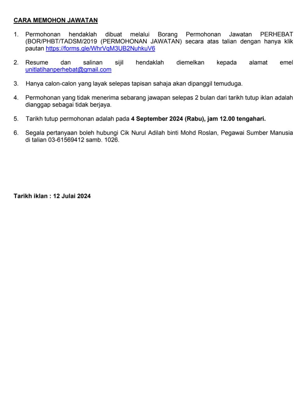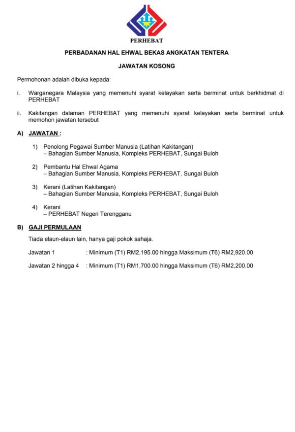 Iklan Kini Jawatan Kosong Perbadanan Hal Ehwal Bekas Angkatan Tentera (PERHEBAT)