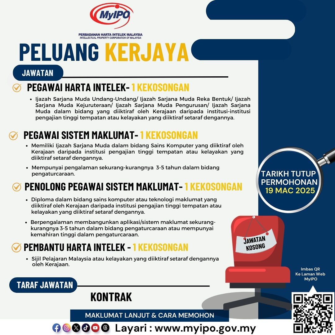 Iklan Kini Jawatan Kosong Perbadanan Harta Intelek Malaysia (MyIPO) Klik Jawatan Disini Like serta Ikut Facebook Kami, follow Chanel WhatsApp Jawatan Kosong & Telegram Portal SPA9 untuk capaian pantas kekosongan jawatan daripada kami sekarang.