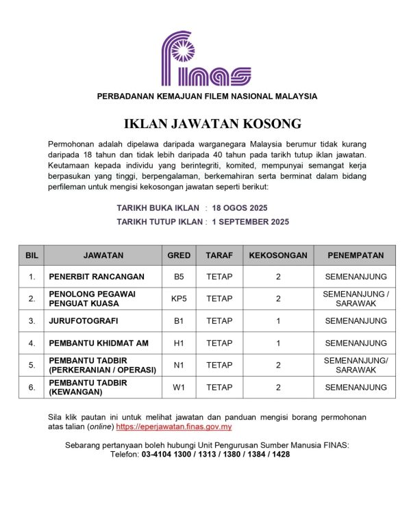 Iklan Kini Jawatan Kosong Perbadanan Kemajuan Filem Nasional Malaysia (FINAS) Like serta Ikut Facebook Kami, follow Chanel WhatsApp Jawatan Kosong & Telegram Portal SPA9 untuk capaian pantas kekosongan jawatan daripada kami sekarang. Klik Iklan Disini