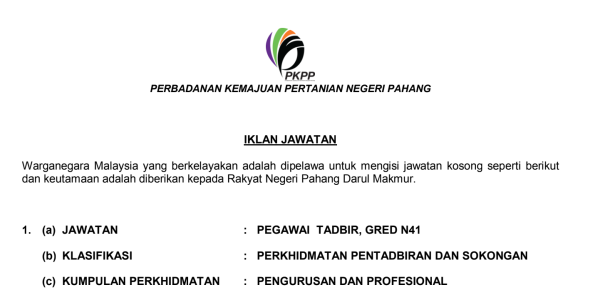 Iklan Kini Jawatan Kosong Perbadanan Kemajuan Pertanian Negeri Pahang (PKPP) Like serta Ikut Facebook Kami, follow Chanel WhatsApp Jawatan Kosong & Telegram Portal SPA9 untuk capaian pantas kekosongan jawatan daripada kami sekarang. Klik Jawatan Disini