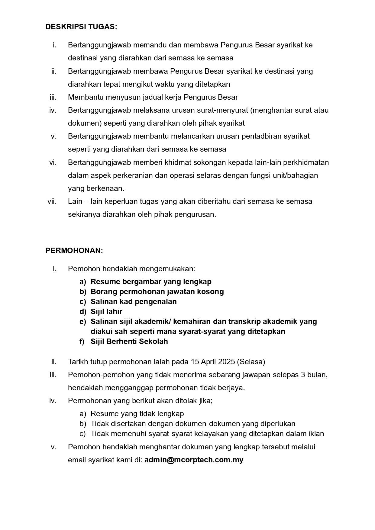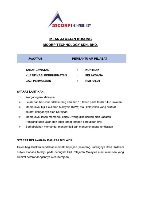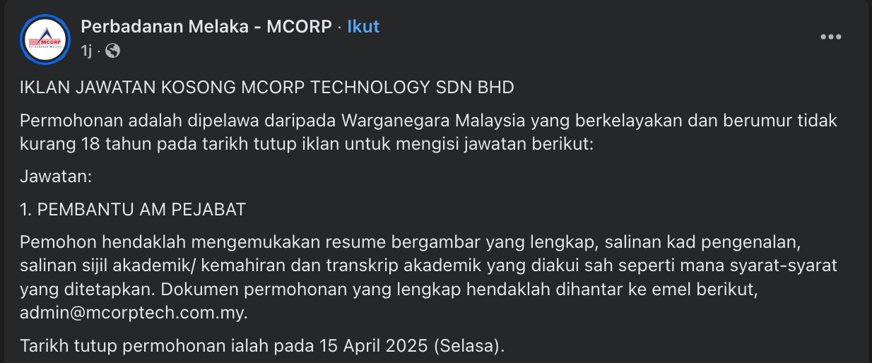 Iklan Kini Jawatan Kosong Perbadanan Melaka (MCORP) Klik Jawatan Disini Like serta Ikut Facebook Kami, follow Chanel WhatsApp Jawatan Kosong & Telegram Portal SPA9 untuk capaian pantas kekosongan jawatan daripada kami sekarang.