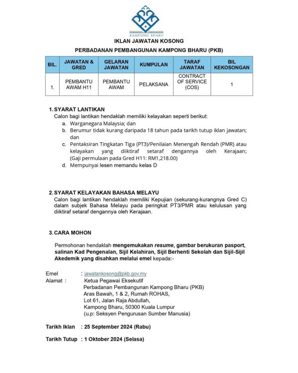 Iklan Kini Jawatan Kosong Perbadanan Pembangunan Kampong Bharu (PKB) Like serta Ikut Facebook Kami, follow Chanel WhatsApp Jawatan Kosong & Telegram Portal SPA9 untuk capaian pantas kekosongan jawatan daripada kami sekarang. Klik Jawatan Disini