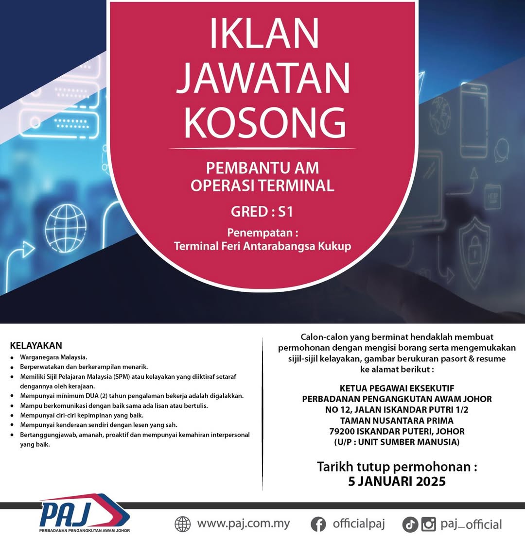 Iklan Kini Jawatan Kosong Perbadanan Pengangkutan Awam Johor Like serta Ikut Facebook Kami, follow Chanel WhatsApp Jawatan Kosong & Telegram Portal SPA9 untuk capaian pantas kekosongan jawatan daripada kami sekarang. Klik Iklan Jawatan