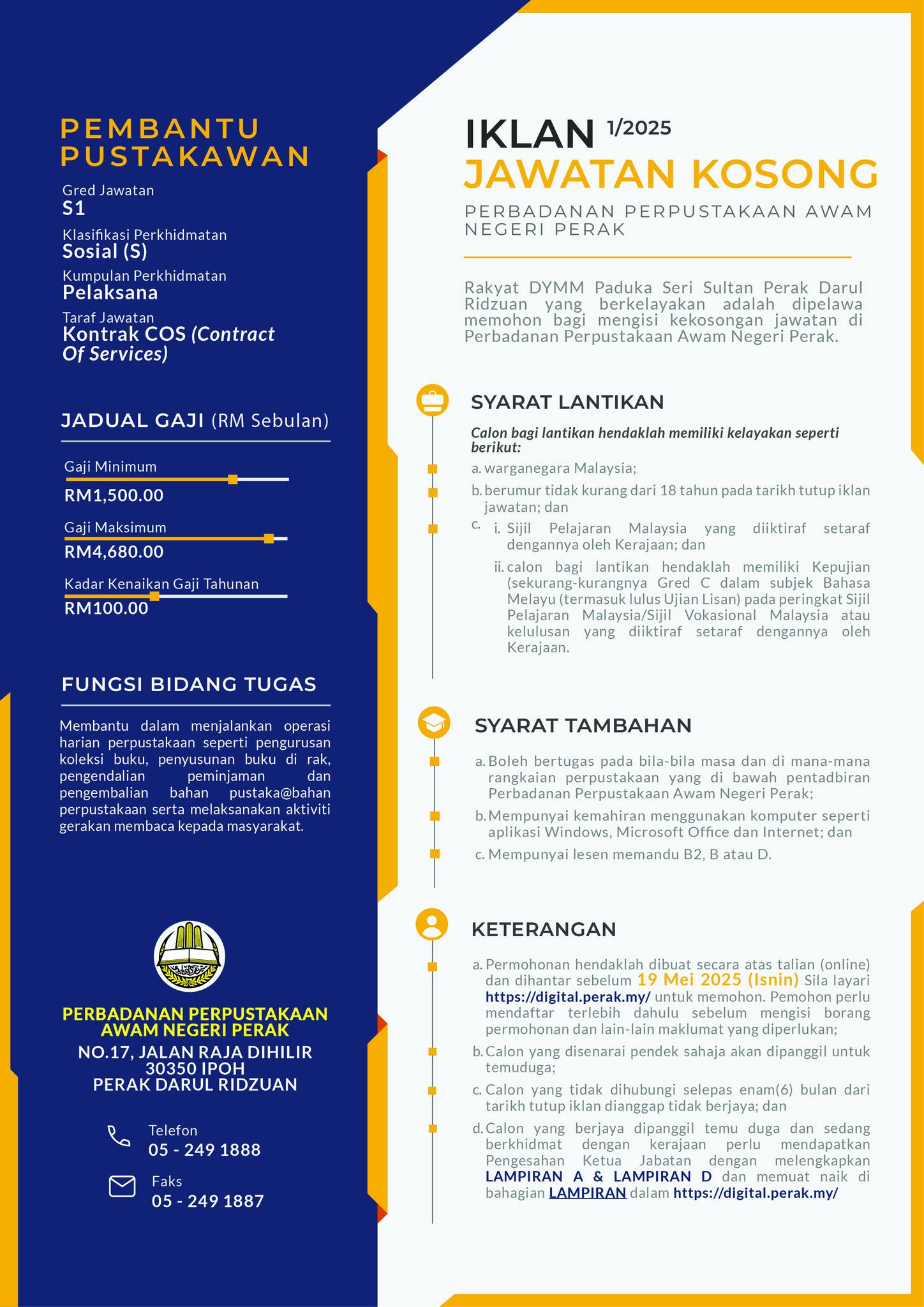 Iklan Kini Jawatan Kosong Perbadanan Perpustakaan Awam Negeri Perak Klik Jawatan Disini Like serta Ikut Facebook Kami, follow Chanel WhatsApp Jawatan Kosong & Telegram Portal SPA9 untuk capaian pantas kekosongan jawatan daripada kami sekarang.