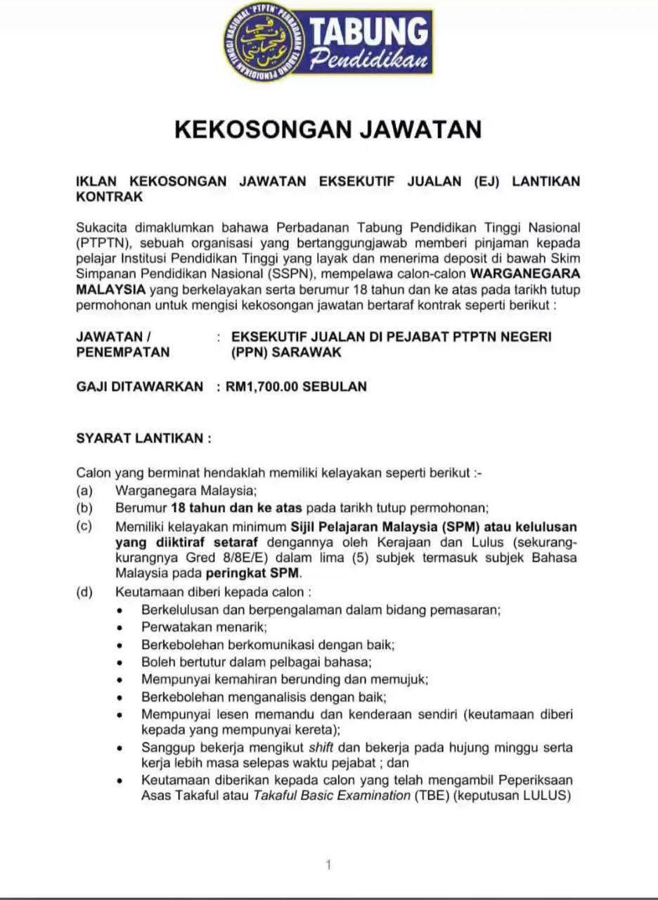 Iklan Kini Jawatan Kosong Perbadanan Tabung Pendidikan Tinggi Nasional (PTPTN) Like serta Ikut Facebook Kami, follow Chanel WhatsApp Jawatan Kosong & Telegram Portal SPA9 untuk capaian pantas kekosongan jawatan daripada kami sekarang.