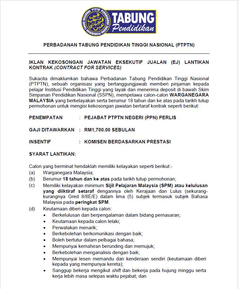 Iklan Kini Jawatan Kosong Perbadanan Tabung Pendidikan Tinggi Nasional (PTPTN) Like serta Ikut Facebook Kami, follow Chanel WhatsApp Jawatan Kosong & Telegram Portal SPA9 untuk capaian pantas kekosongan jawatan daripada kami sekarang. Klik Iklan Disini