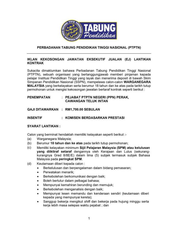 Iklan Kini Jawatan Kosong Perbadanan Tabung Pendidikan Tinggi Nasional (PTPTN) Like serta Ikut Facebook Kami, follow Chanel WhatsApp Jawatan Kosong & Telegram Portal SPA9 untuk capaian pantas kekosongan jawatan daripada kami sekarang.