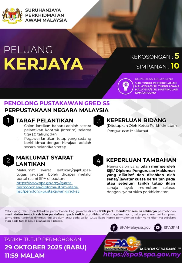 Iklan Kini Jawatan Kosong Perpustakaan Negara Malaysia Like serta Ikut Facebook Kami, follow Chanel WhatsApp Jawatan Kosong & Telegram Portal SPA9 untuk capaian pantas kekosongan jawatan daripada kami sekarang. Klik Iklan Jawatan Disini