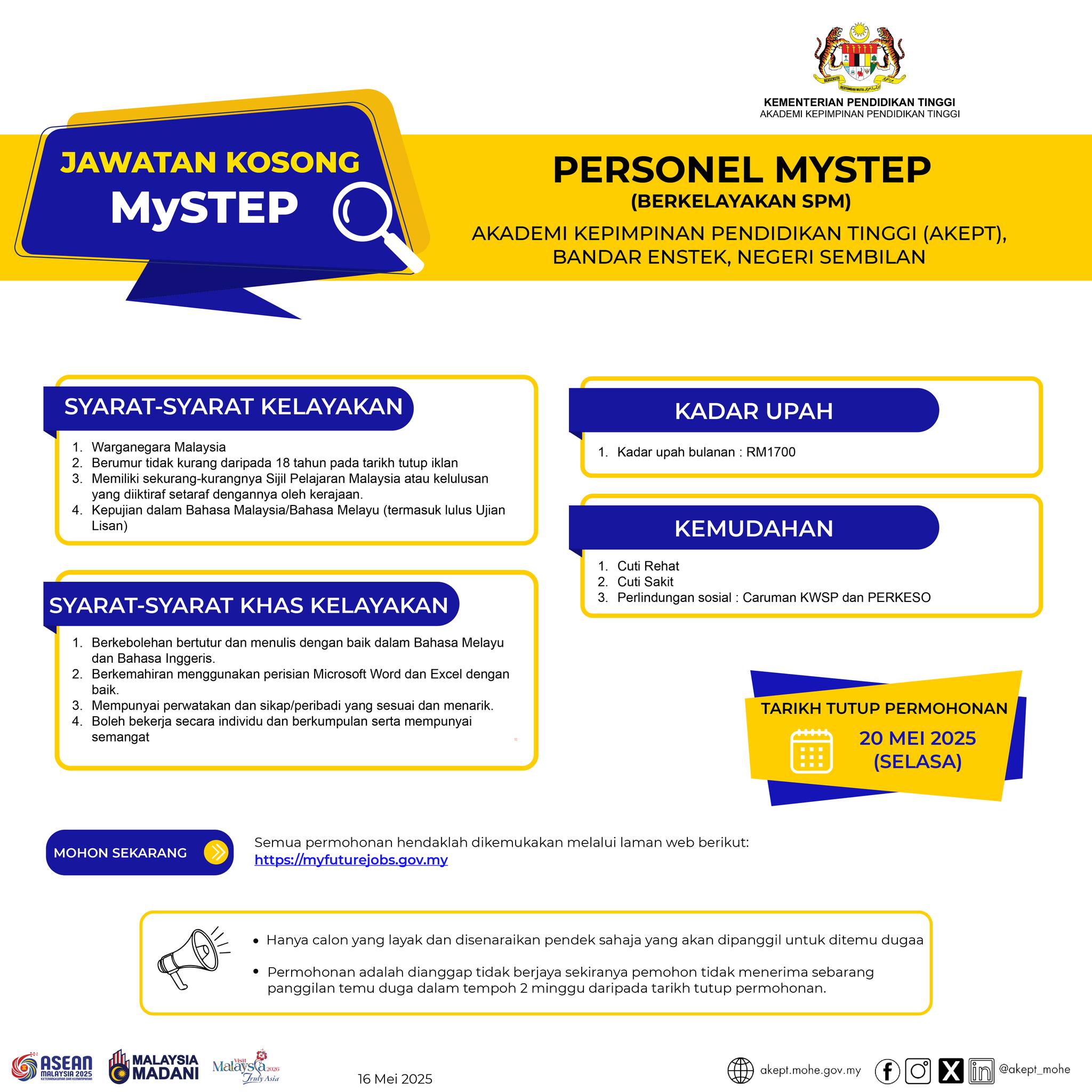Iklan Kini Jawatan Kosong Personel MySTEP Akademi Kepimpinan Pendidikan Tinggi (AKEPT) Like serta Ikut Facebook Kami, follow Chanel WhatsApp Jawatan Kosong & Telegram Portal SPA9 untuk capaian pantas kekosongan jawatan daripada kami sekarang. Klik Jawatan Disini