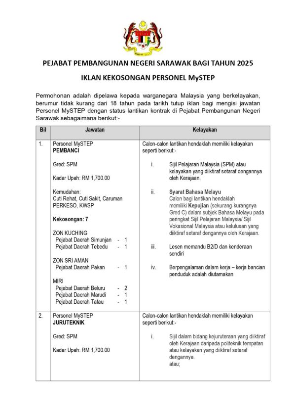 IKlan Kini Jawatan Kosong Personel MySTEP Pejabat Pembangunan Negeri Sarawak Klik Iklan Disini Like serta Ikut Facebook Kami, follow Chanel WhatsApp Jawatan Kosong & Telegram Portal SPA9 untuk capaian pantas kekosongan jawatan daripada kami sekarang.