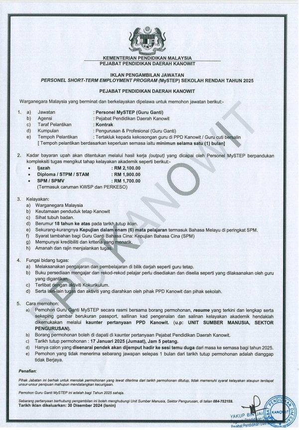 Iklan Kini Jawatan Kosong Personel MySTEP Pejabat Pendidikan Daerah Kanowit Sarawak Like serta Ikut Facebook Kami, follow Chanel WhatsApp Jawatan Kosong & Telegram Portal SPA9 untuk capaian pantas kekosongan jawatan daripada kami sekarang. Klik Iklan Jawatan