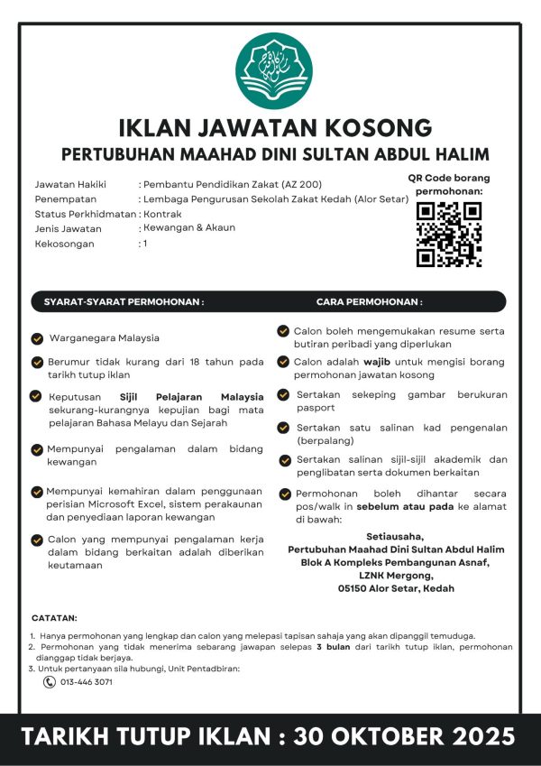 Iklan Kini Jawatan Kosong Pertubuhan Maahad Dini Sultan Abdul Halim (Sekolah Zakat Kedah)