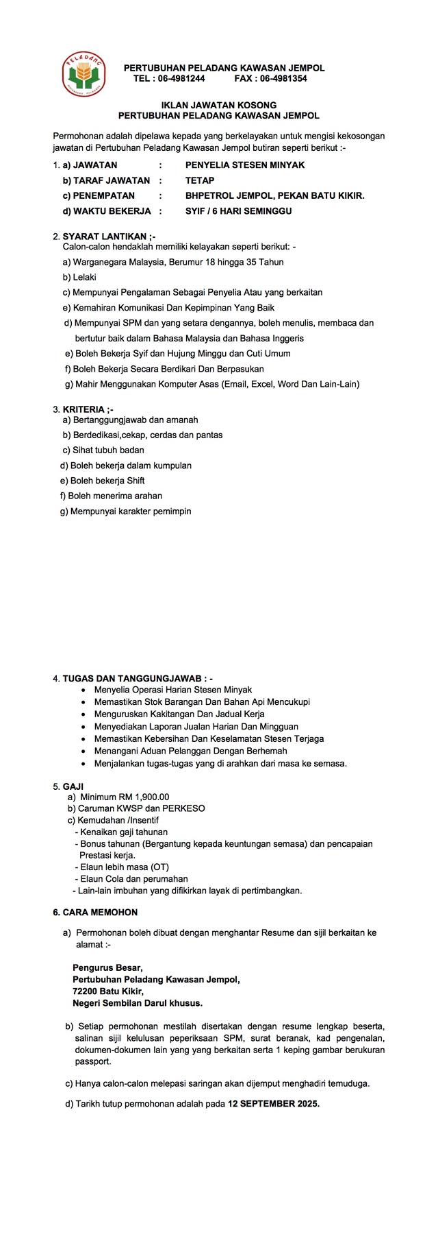 Iklan Kini Jawatan Kosong Pertubuhan Peladang Kawasan Jempol Klik Iklan Disini Like serta Ikut Facebook Kami, follow Chanel WhatsApp Jawatan Kosong & Telegram Portal SPA9 untuk capaian pantas kekosongan jawatan daripada kami sekarang.