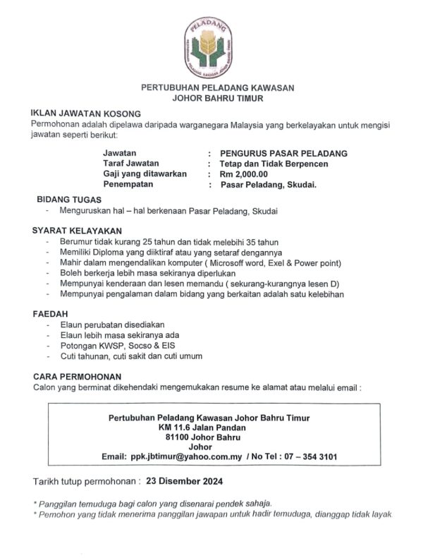 Iklan Kini Jawatan Kosong Pertubuhan Peladang Kawasan Johor Bahru Timur Klik Iklan Jawatan Like serta Ikut Facebook Kami, follow Chanel WhatsApp Jawatan Kosong & Telegram Portal SPA9 untuk capaian pantas kekosongan jawatan daripada kami sekarang.