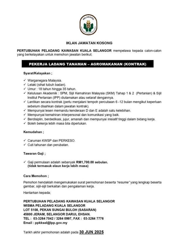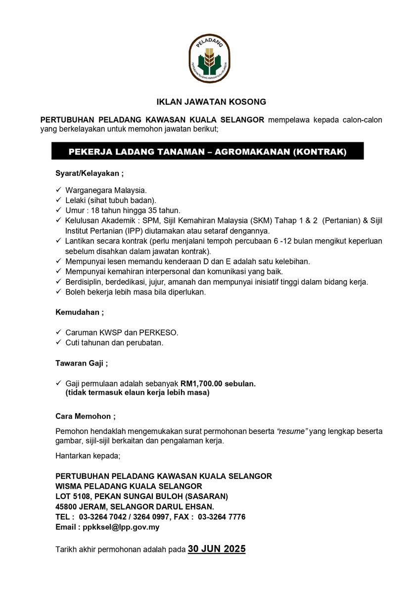 Iklan Kini Jawatan Kosong Pertubuhan Peladang Kawasan Kuala Selangor Klik Jawatan Disini Like serta Ikut Facebook Kami, follow Chanel WhatsApp Jawatan Kosong & Telegram Portal SPA9 untuk capaian pantas kekosongan jawatan daripada kami sekarang.