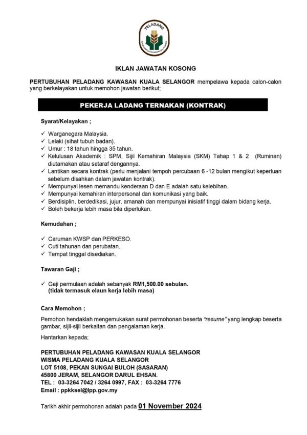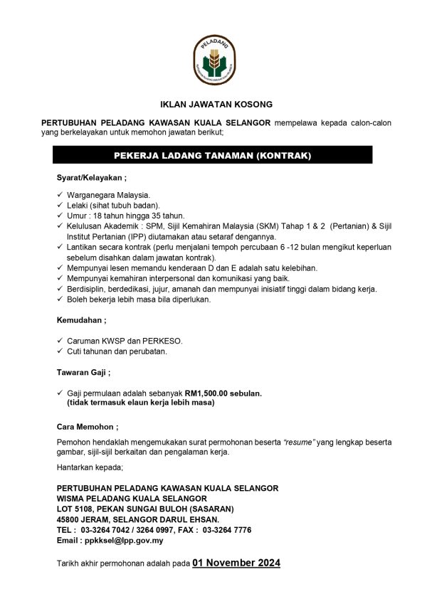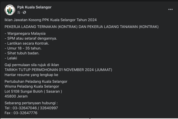 Iklan Kini Jawatan Kosong Pertubuhan Peladang Kawasan Kuala Selangor Klik Jawatan Disini Like serta Ikut Facebook Kami, follow Chanel WhatsApp Jawatan Kosong & Telegram Portal SPA9 untuk capaian pantas kekosongan jawatan daripada kami sekarang.