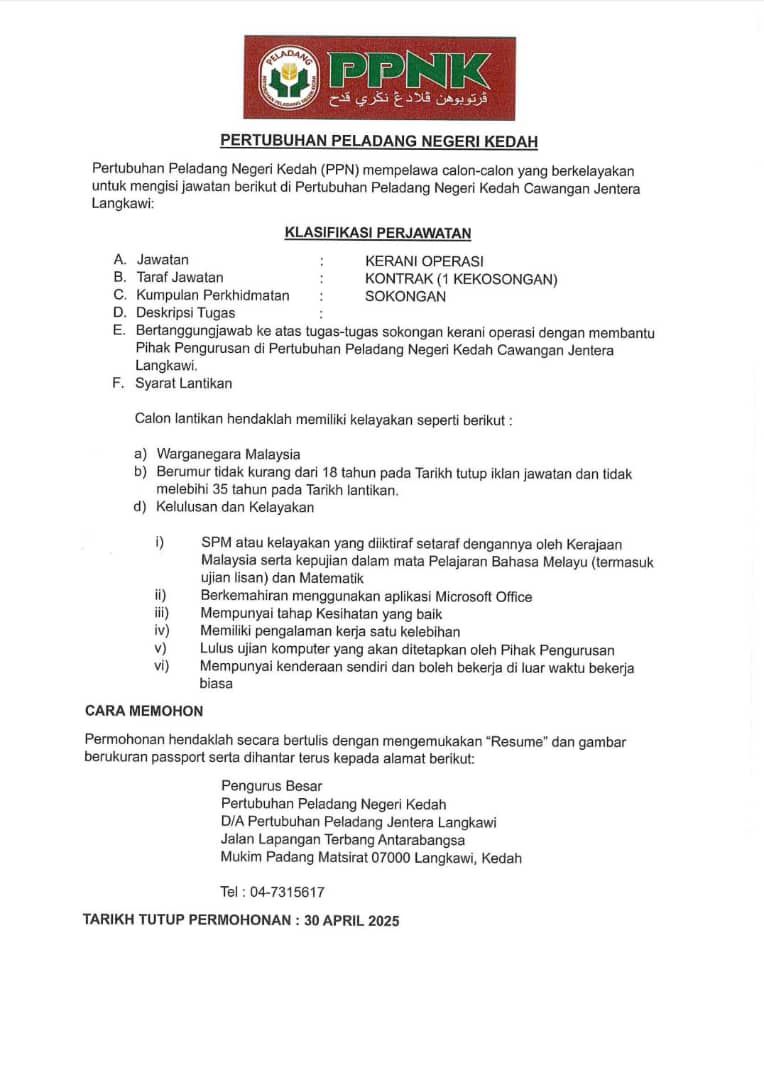 Iklan Kini Jawatan Kosong Pertubuhan Peladang Negeri Kedah Like serta Ikut Facebook Kami, follow Chanel WhatsApp Jawatan Kosong & Telegram Portal SPA9 untuk capaian pantas kekosongan jawatan daripada kami sekarang. Klik Iklan Disini