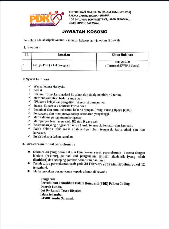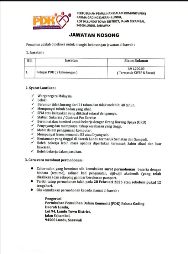 Iklan Kini Jawatan Kosong Pertubuhan Pemulihan Dalam Komuniti (PPDK) Pakma Gading Lundu Like serta Ikut Facebook Kami, follow Chanel WhatsApp Jawatan Kosong & Telegram Portal SPA9 untuk capaian pantas kekosongan jawatan daripada kami sekarang.