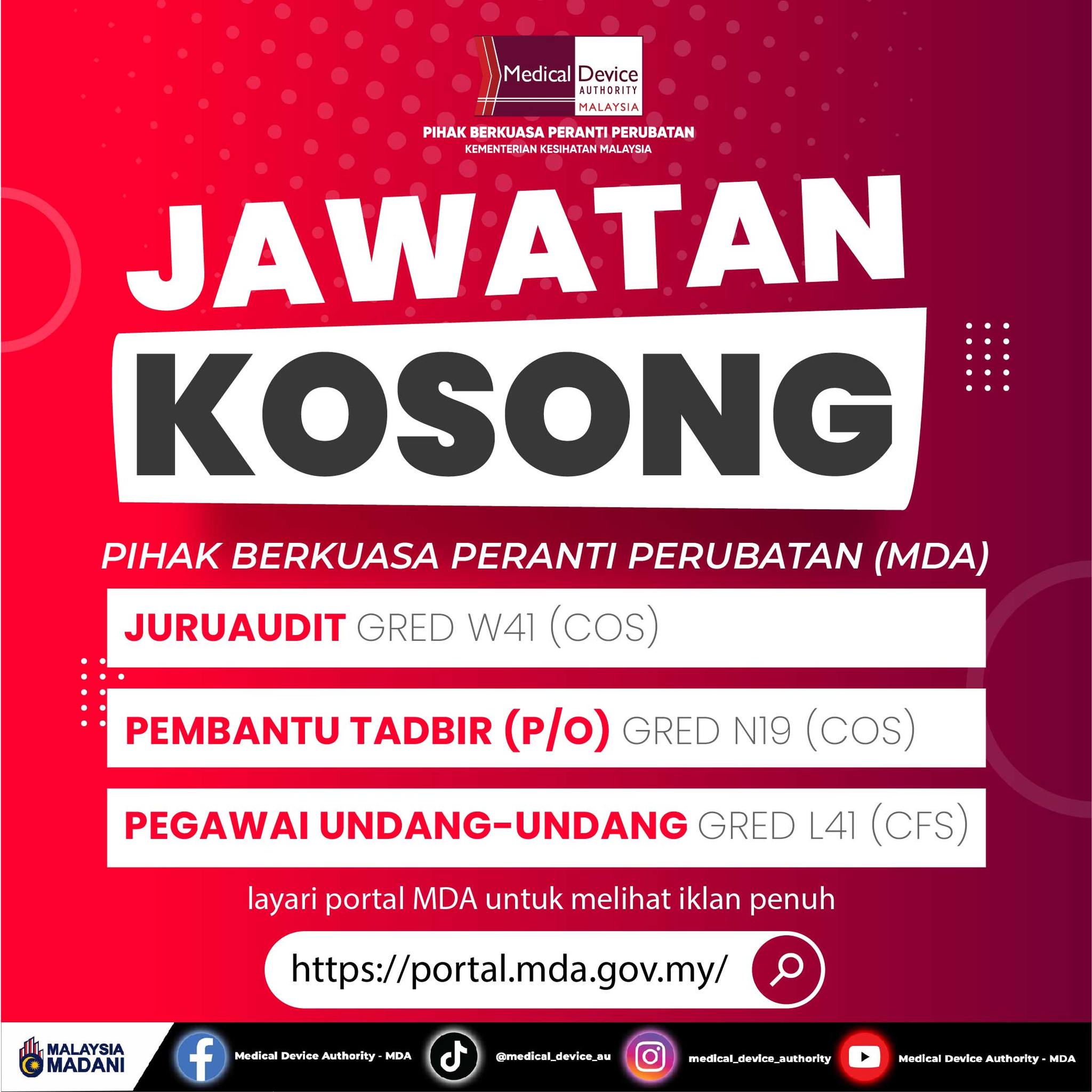 Iklan Kini Jawatan Kosong Pihak Berkuasa Peranti Perubatan (MDA) Like serta Ikut Facebook Kami, follow Chanel WhatsApp Jawatan Kosong & Telegram Portal SPA9 untuk capaian pantas kekosongan jawatan daripada kami sekarang. Iklan Jawatan
