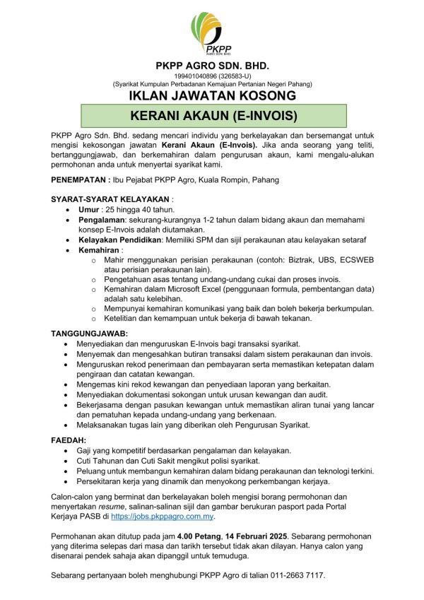 Iklan Kini Jawatan Kosong PKPP Agro Sdn Bhd Like serta Ikut Facebook Kami, follow Chanel WhatsApp Jawatan Kosong & Telegram Portal SPA9 untuk capaian pantas kekosongan jawatan daripada kami sekarang. Klik Jawatan Disini