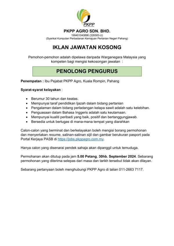 Iklan Kini Jawatan Kosong PKPP Agro Sdn Bhd Like serta Ikut Facebook Kami, follow Chanel WhatsApp Jawatan Kosong & Telegram Portal SPA9 untuk capaian pantas kekosongan jawatan daripada kami sekarang. Klik Jawatan Disini
