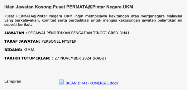 Iklan Kini Jawatan Kosong Pusat GENIUS@Pintar Negara UKM Like serta Ikut Facebook Kami, follow Chanel WhatsApp Jawatan Kosong & Telegram Portal SPA9 untuk capaian pantas kekosongan jawatan daripada kami sekarang. Klik Iklan Jawatan