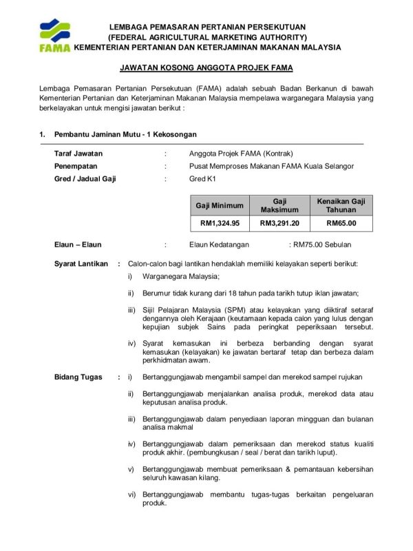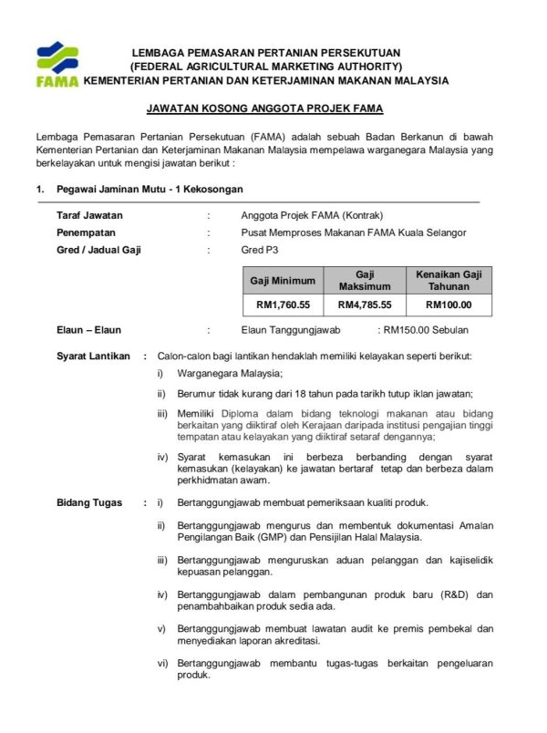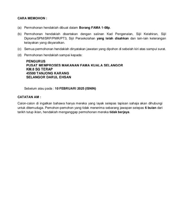 Iklan Kini Jawatan Kosong Pusat Memproses Makanan FAMA Klik Iklan Jawatan Like serta Ikut Facebook Kami, follow Chanel WhatsApp Jawatan Kosong & Telegram Portal SPA9 untuk capaian pantas kekosongan jawatan daripada kami sekarang.
