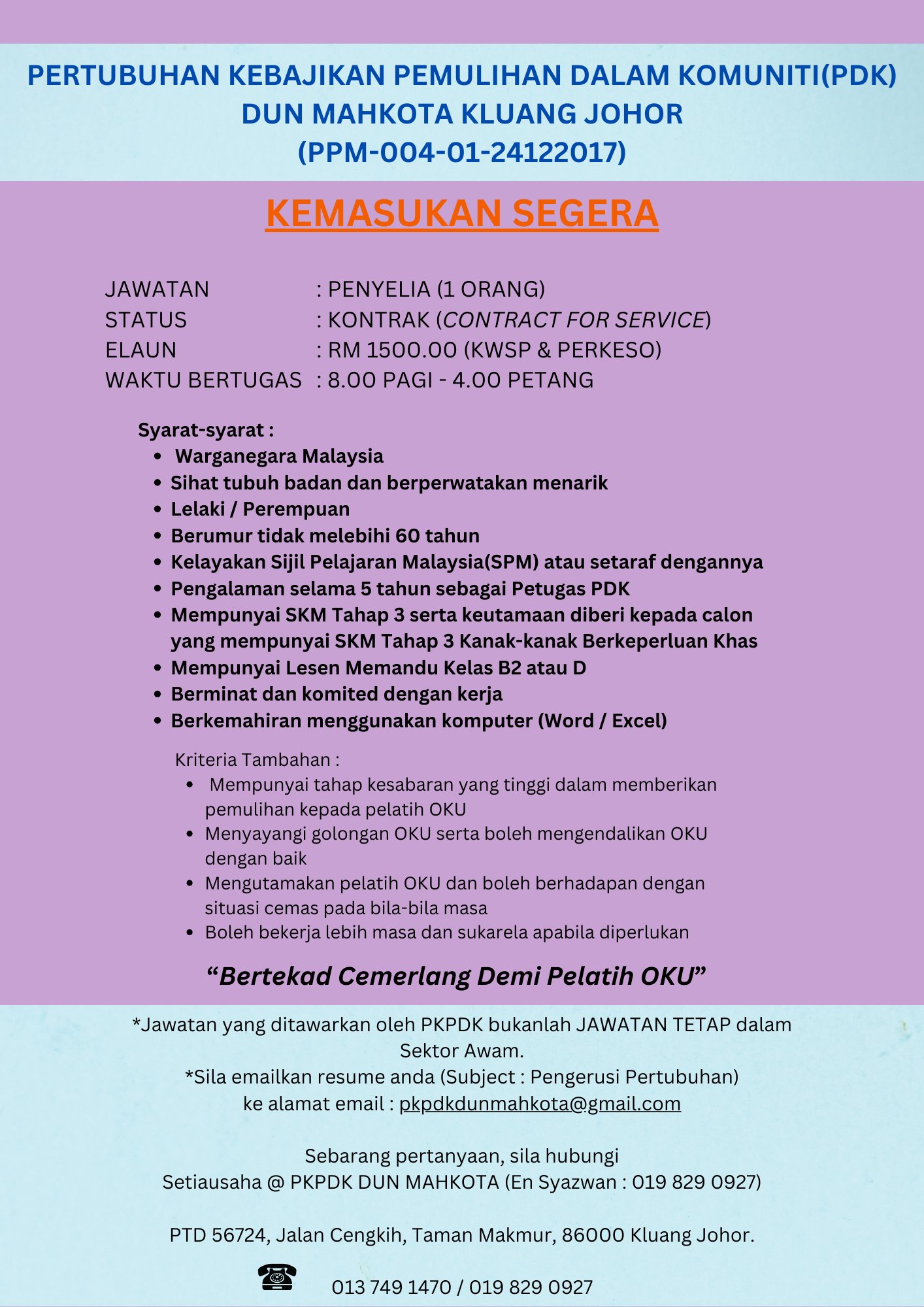 Iklan Kini Jawatan Kosong Pusat Pemulihan Dalam Komuniti (PDK) Like serta Ikut Facebook Kami, follow Chanel WhatsApp Jawatan Kosong & Telegram Portal SPA9 untuk capaian pantas kekosongan jawatan daripada kami sekarang. Klik Jawatan Disini