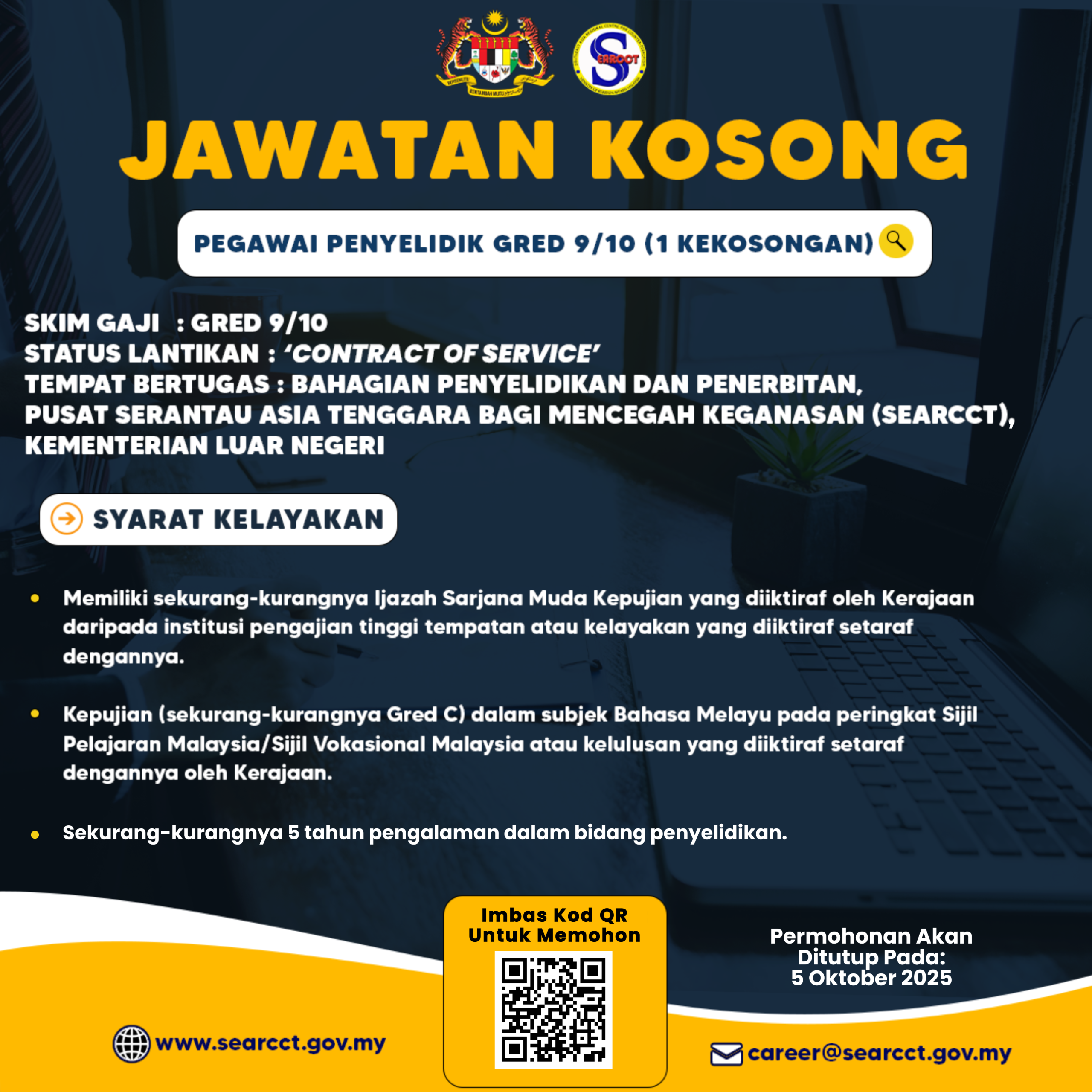 Iklan Kini Jawatan Kosong Pusat Serantau Asia Tenggara Bagi Mencegah Keganasan (SEARCCT) Like serta Ikut Facebook Kami, follow Chanel WhatsApp Jawatan Kosong & Telegram Portal SPA9 untuk capaian pantas kekosongan jawatan daripada kami sekarang. Klik Iklan Jawatan