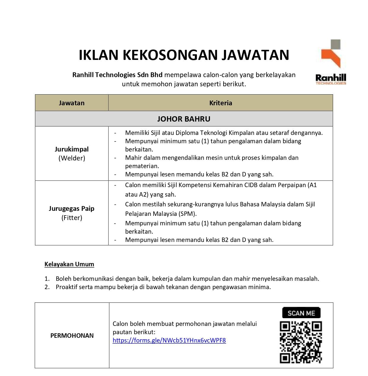 Iklan Kini Jawatan Kosong Ranhill Technologies Sdn. Bhd. Like serta Ikut Facebook Kami, follow Chanel WhatsApp Jawatan Kosong & Telegram Portal SPA9 untuk capaian pantas kekosongan jawatan daripada kami sekarang.