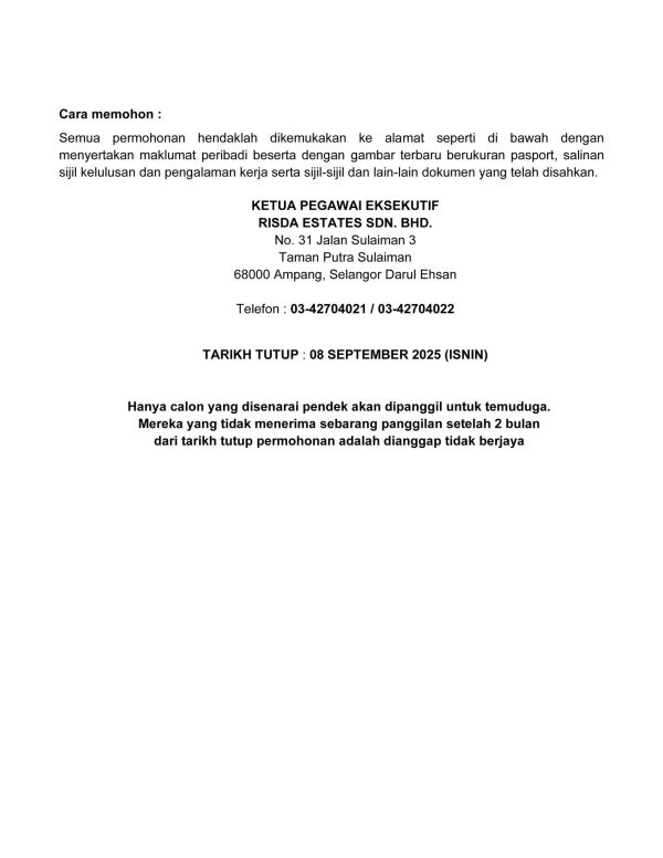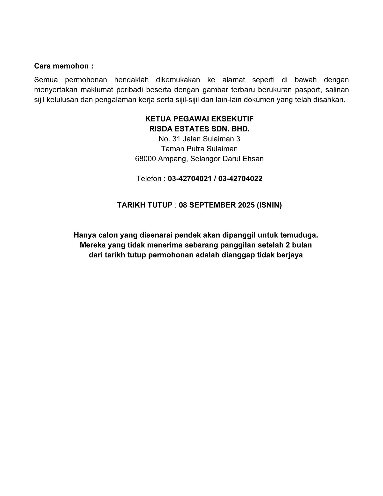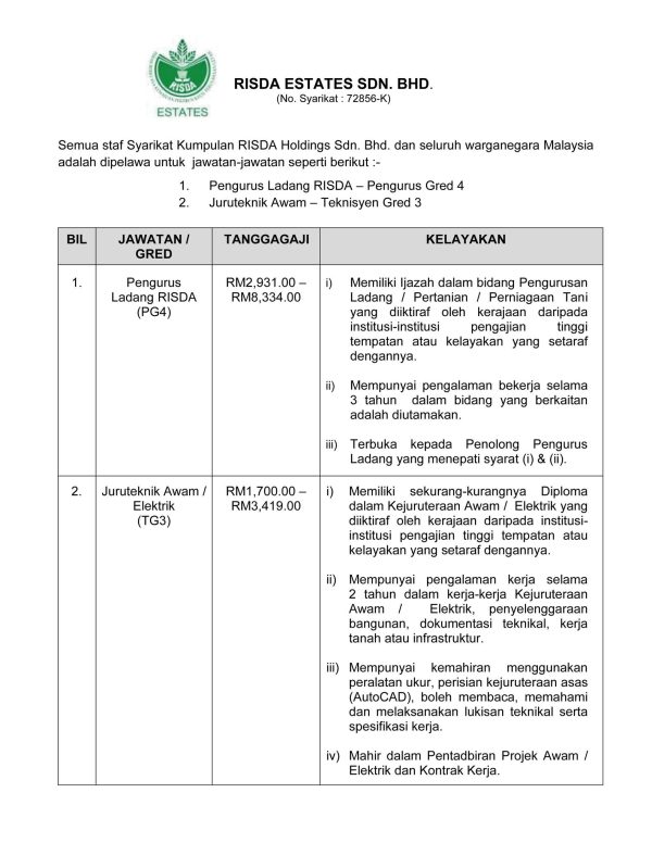 Iklan Kini Jawatan Kosong RISDA Estates Sdn Bhd Like serta Ikut Facebook Kami, follow Chanel WhatsApp Jawatan Kosong & Telegram Portal SPA9 untuk capaian pantas kekosongan jawatan daripada kami sekarang.