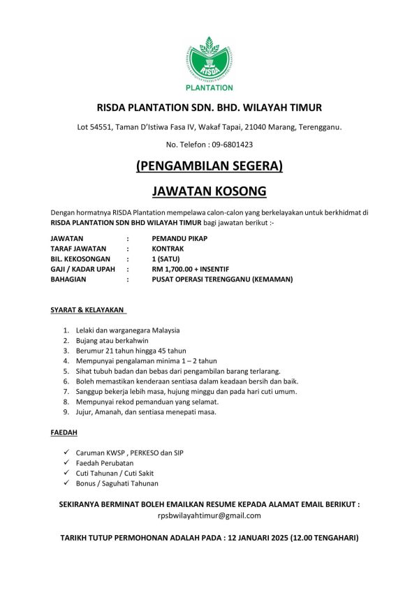 Iklan Kini Jawatan Kosong Risda Plantation Sdn Bhd Like serta Ikut Facebook Kami, follow Chanel WhatsApp Jawatan Kosong & Telegram Portal SPA9 untuk capaian pantas kekosongan jawatan daripada kami sekarang. Klik Iklan Jawatan